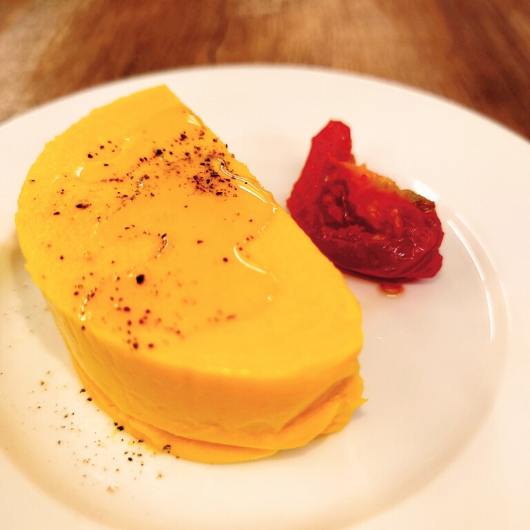 うらごししたカボチャに卵と生クリームを加え、蒸し焼きにしました。