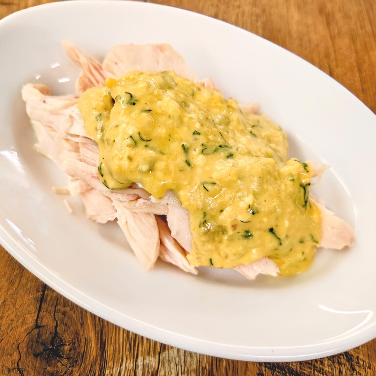 鶏むね肉を白ワインで蒸して、フレンチのラビゴットソースをかけたシンプルなデリです。