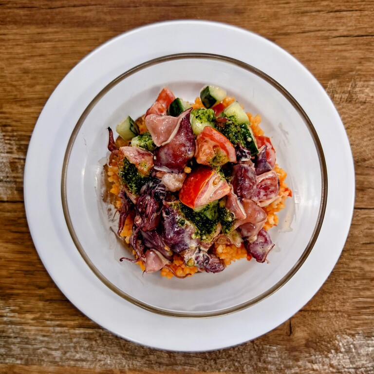 トマト風味のクスクスの上に旬のホタルイカをたっぷりのせました。