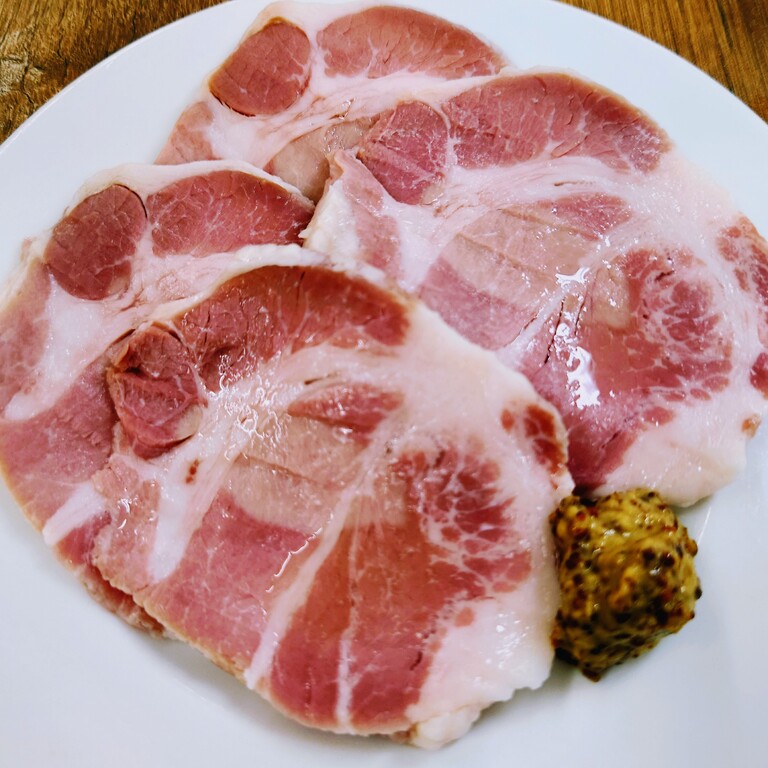 豚肩ロース肉を48時間塩漬けにし、65度のお湯で2時間ゆで上げた自家製のロースハムです。