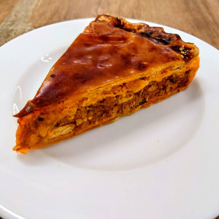 サバと玉ねぎをソテーしてじっくりトマトで煮込み、パイ生地で包んで焼き上げました。