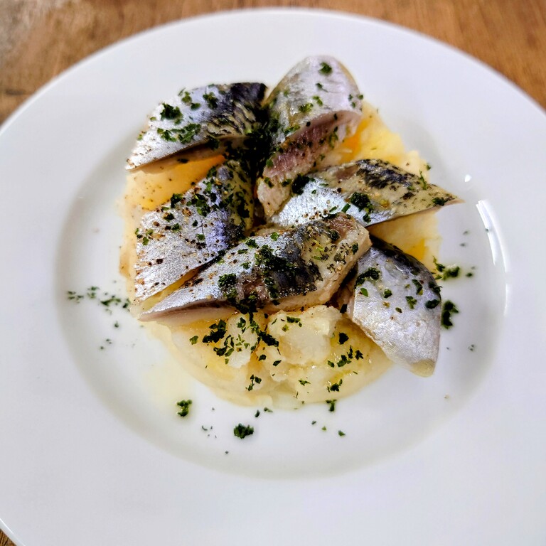 イワシをシェリーヴィネガーと白ワインでマリネにして、玉ねぎを加えたシンプルなポテトサラダを合わせました。