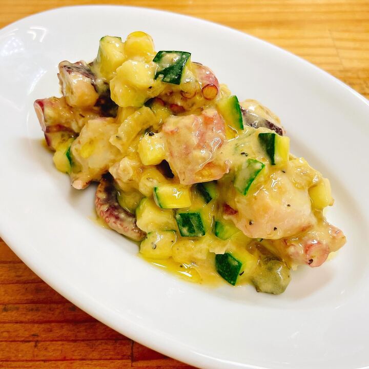 タコをズッキーニ、玉ねぎ、ケッパーと共に自家製マヨネーズとマスタード、レモン汁でシンプルにマリネにしました。
